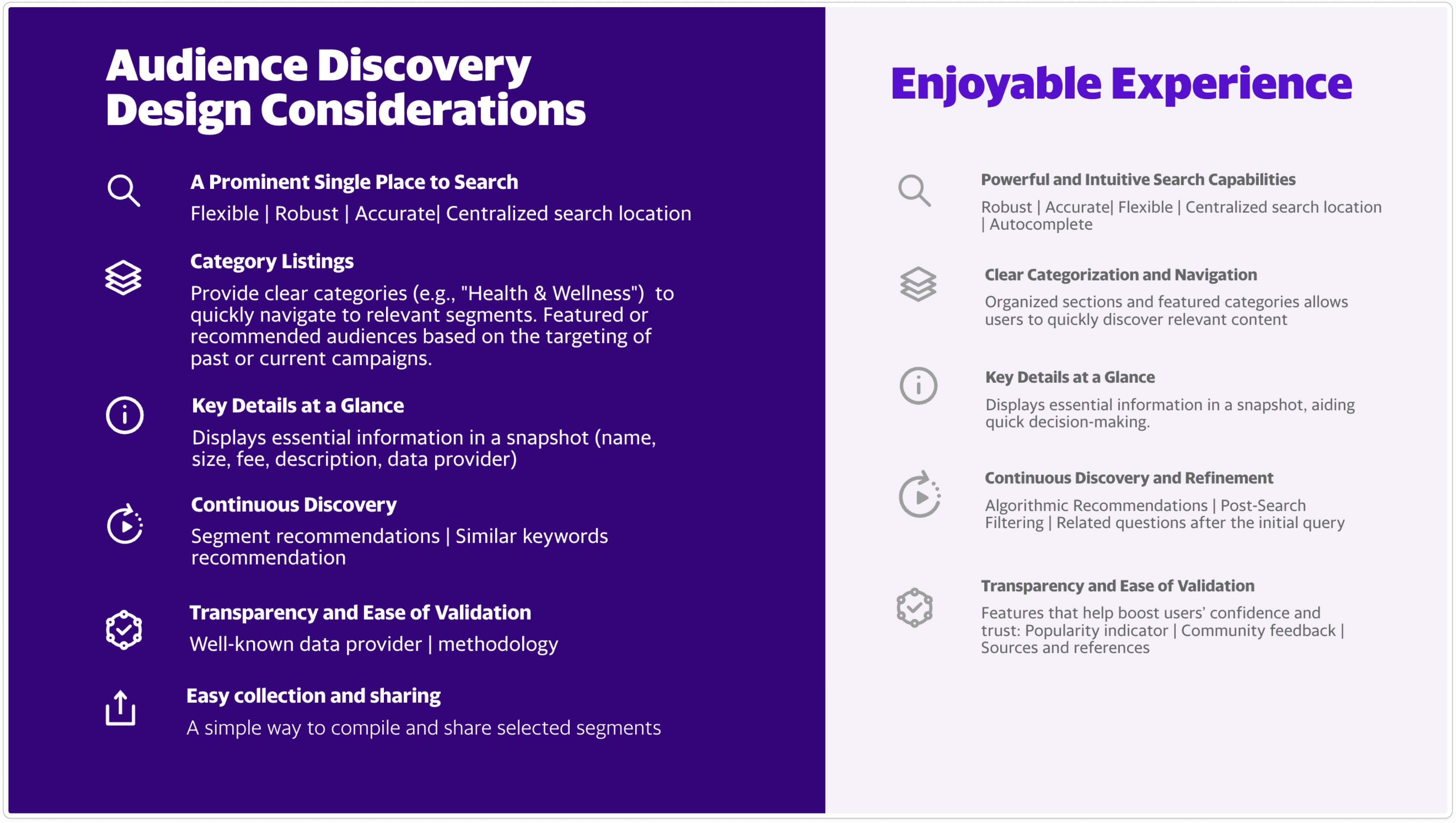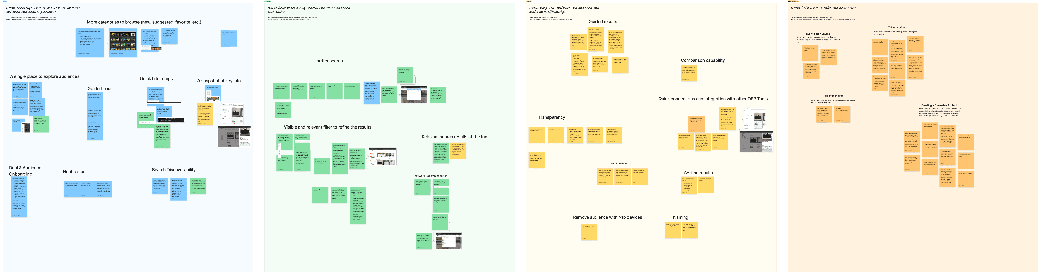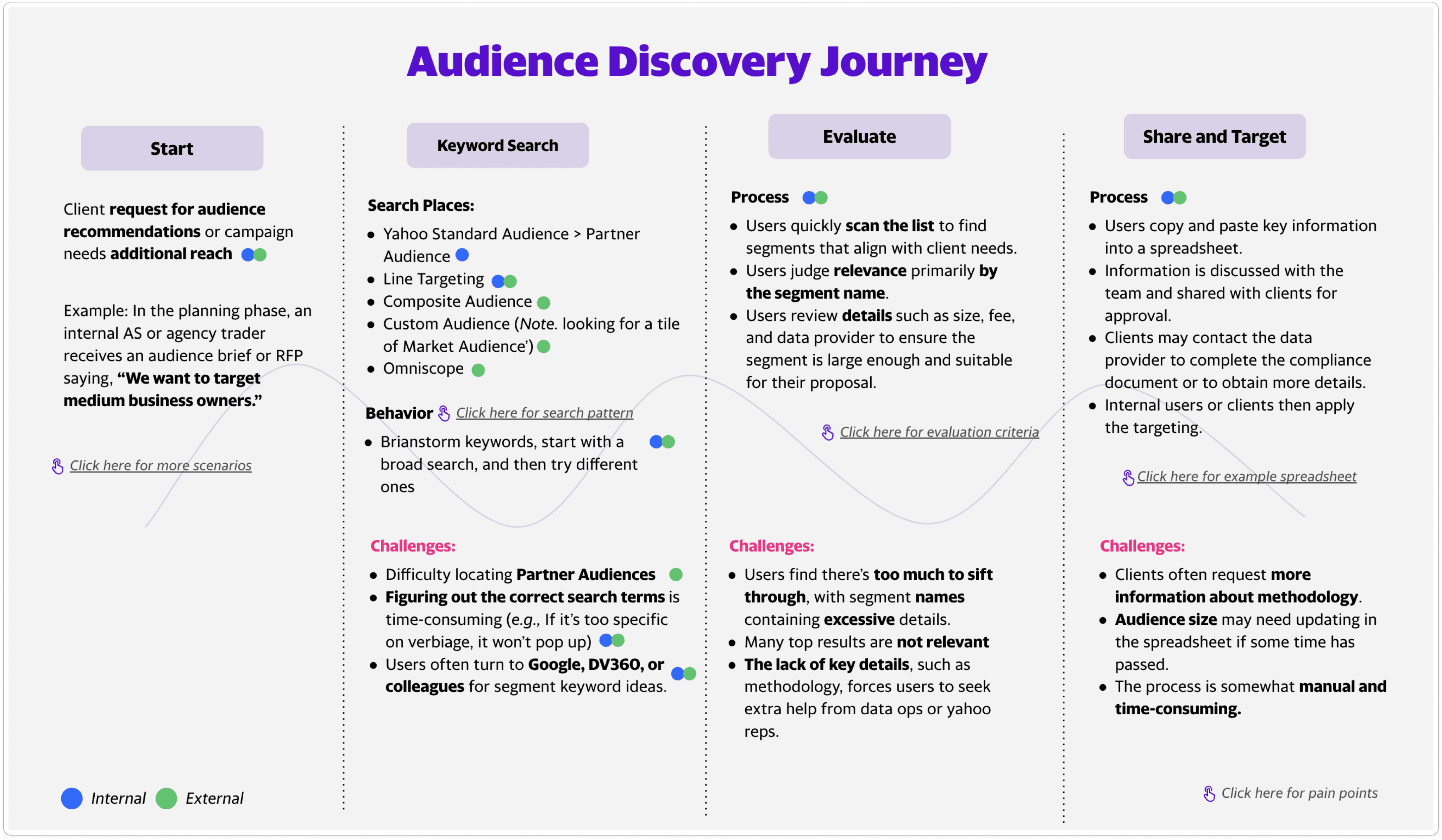 To ground the project in real user needs, we conducted 12 in depth interviews (6 internal users and 6 external users). The interviews helped us uncover where users struggled in the current exploration process and what they considered an ideal way to discover and evaluate audiences. These insights gave us a clear problem frame and concrete opportunity areas for the design direction.