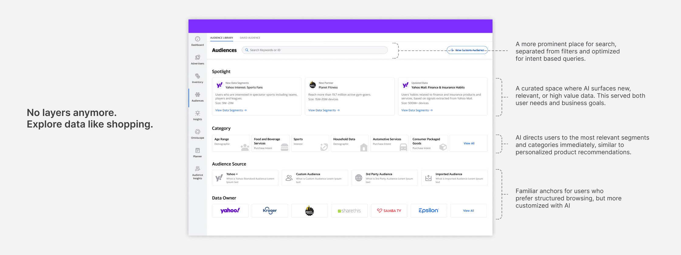 We started by studying several intuitive consumer exploration experiences such as shopping and media platforms, where users can browse large inventories without understanding any underlying structure. Inspired by this, our early direction was to create a landing experience where users could go straight to meaningful segments with AI guiding discovery, instead of navigating layers of data hierarchy.